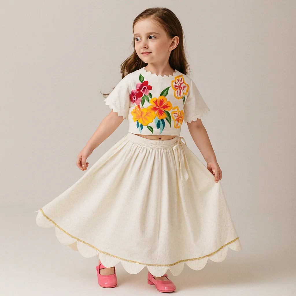 Dress your little one in timeless elegance with our cream-coloured premium cotton embroidered skirt and top set. The soft, breathable fabric ensures all-day comfort, while the delicate embroidery adds a touch of charm and grace. Perfect for birthdays, festive celebrations, or casual outings, this outfit blends style with comfort for every occasion.