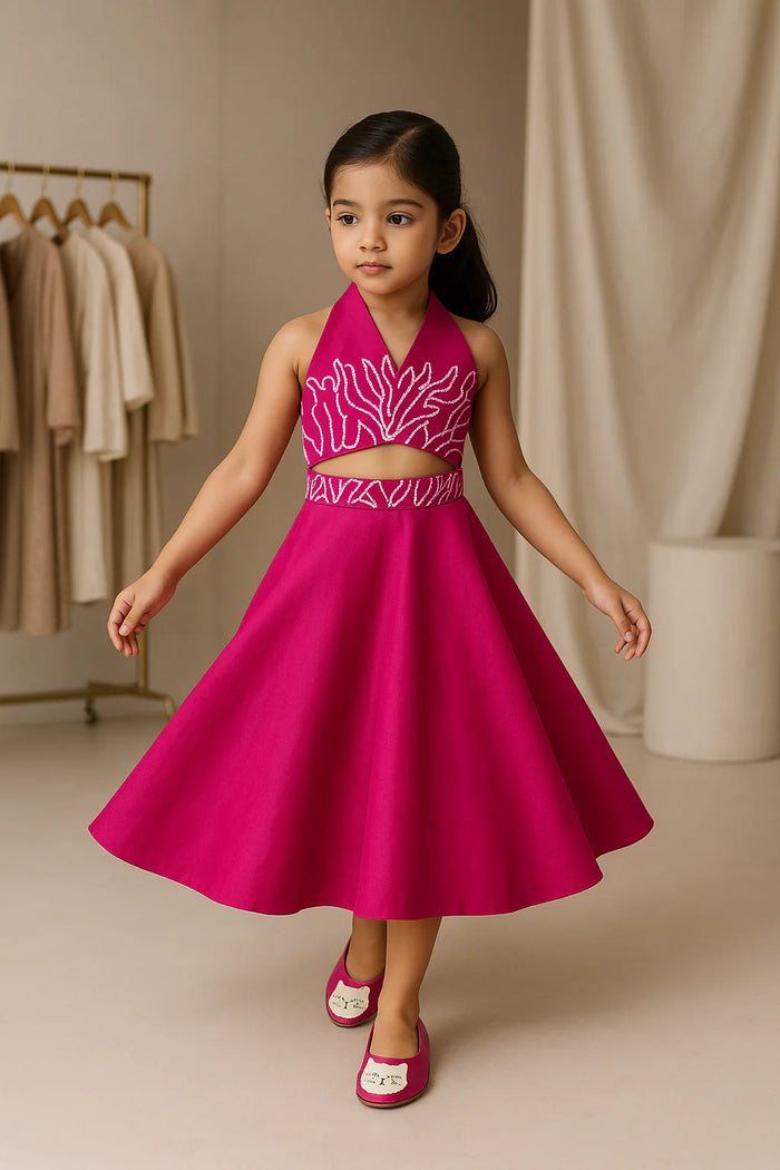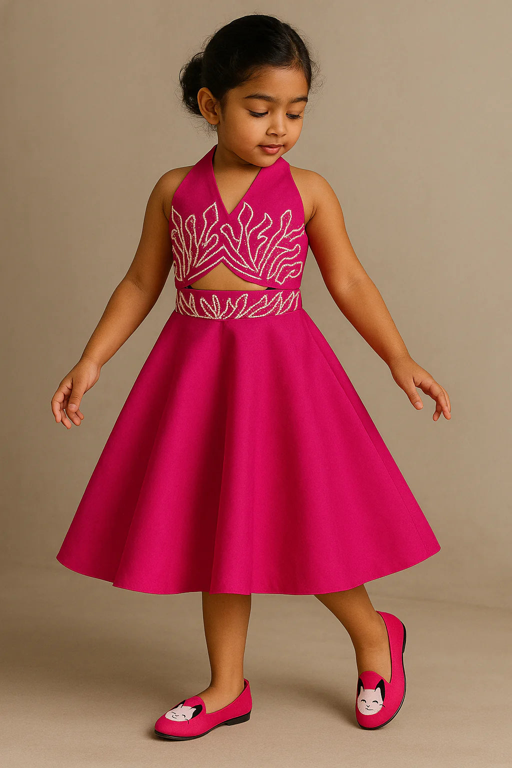 Halter neck top with pearl embroidery at the front and a hook at the back of the neck Top with a back hook closure and a bow enhanced with press buttons SKirt with pearl embroidery on the waistline at the front...