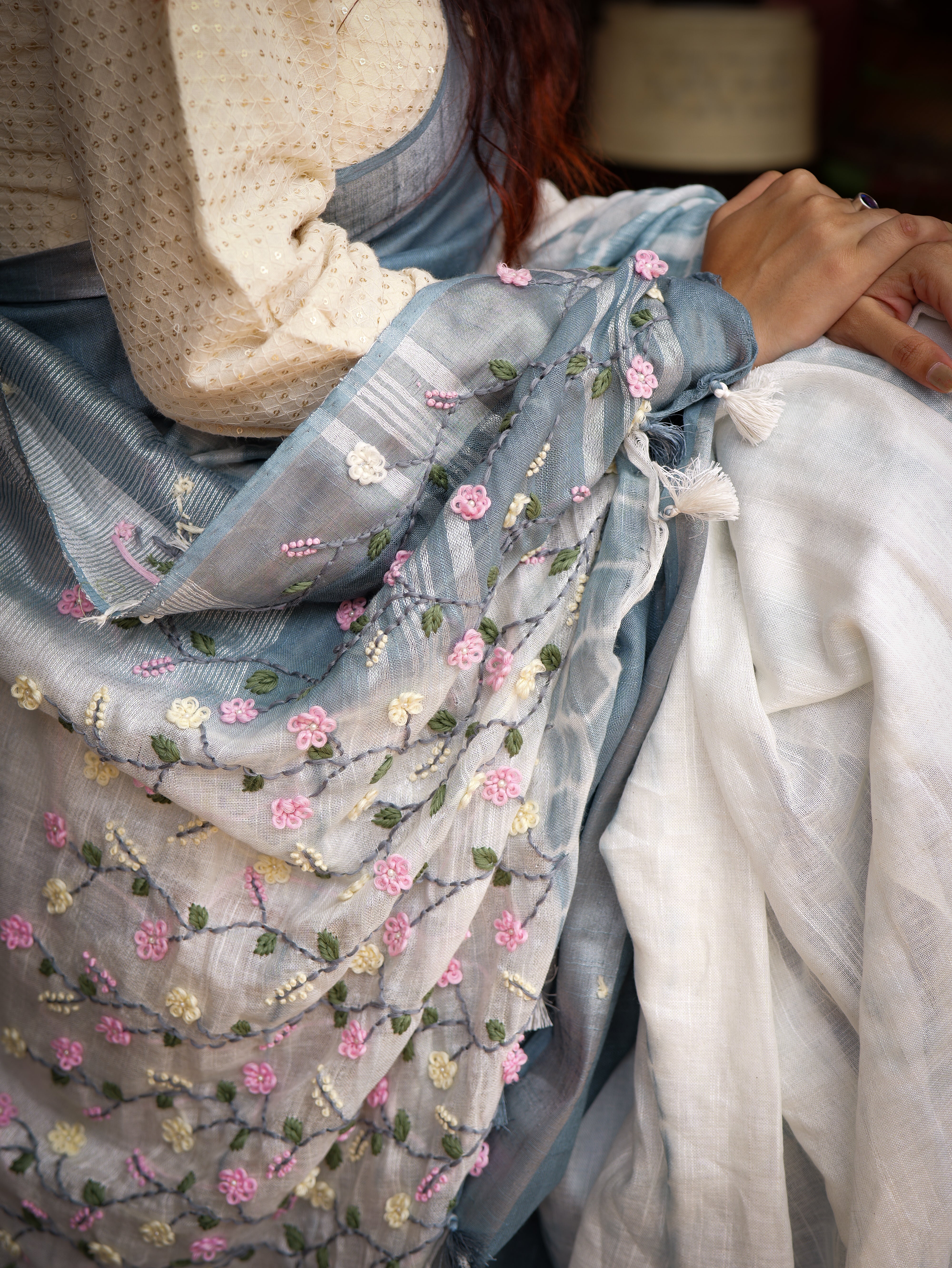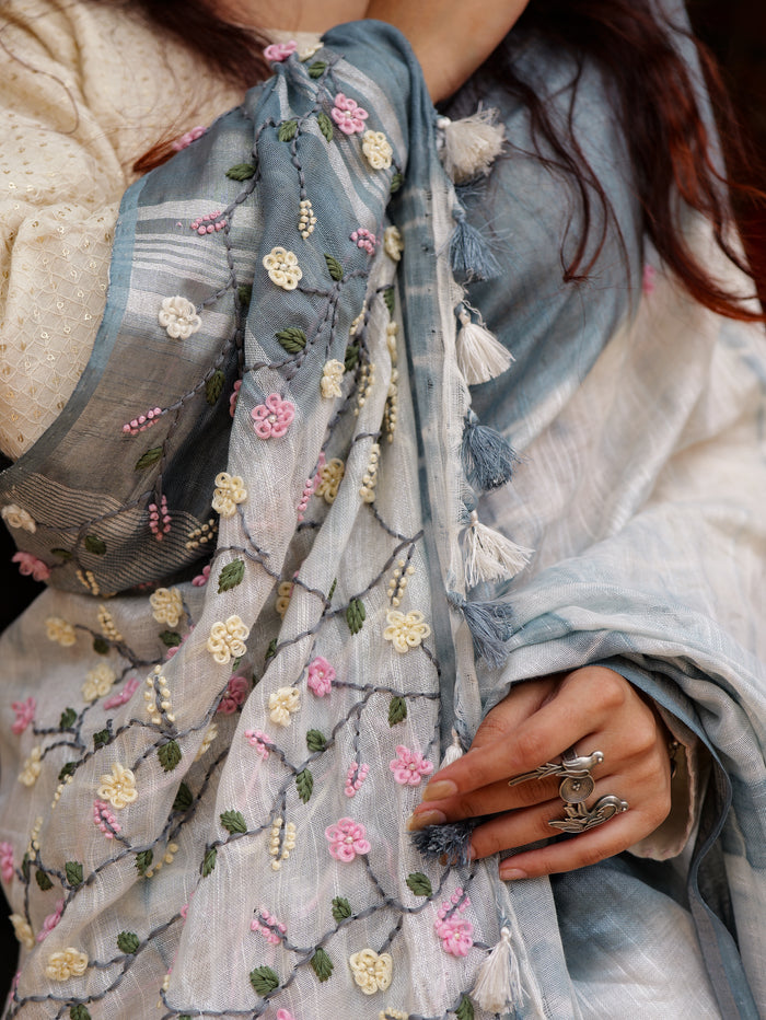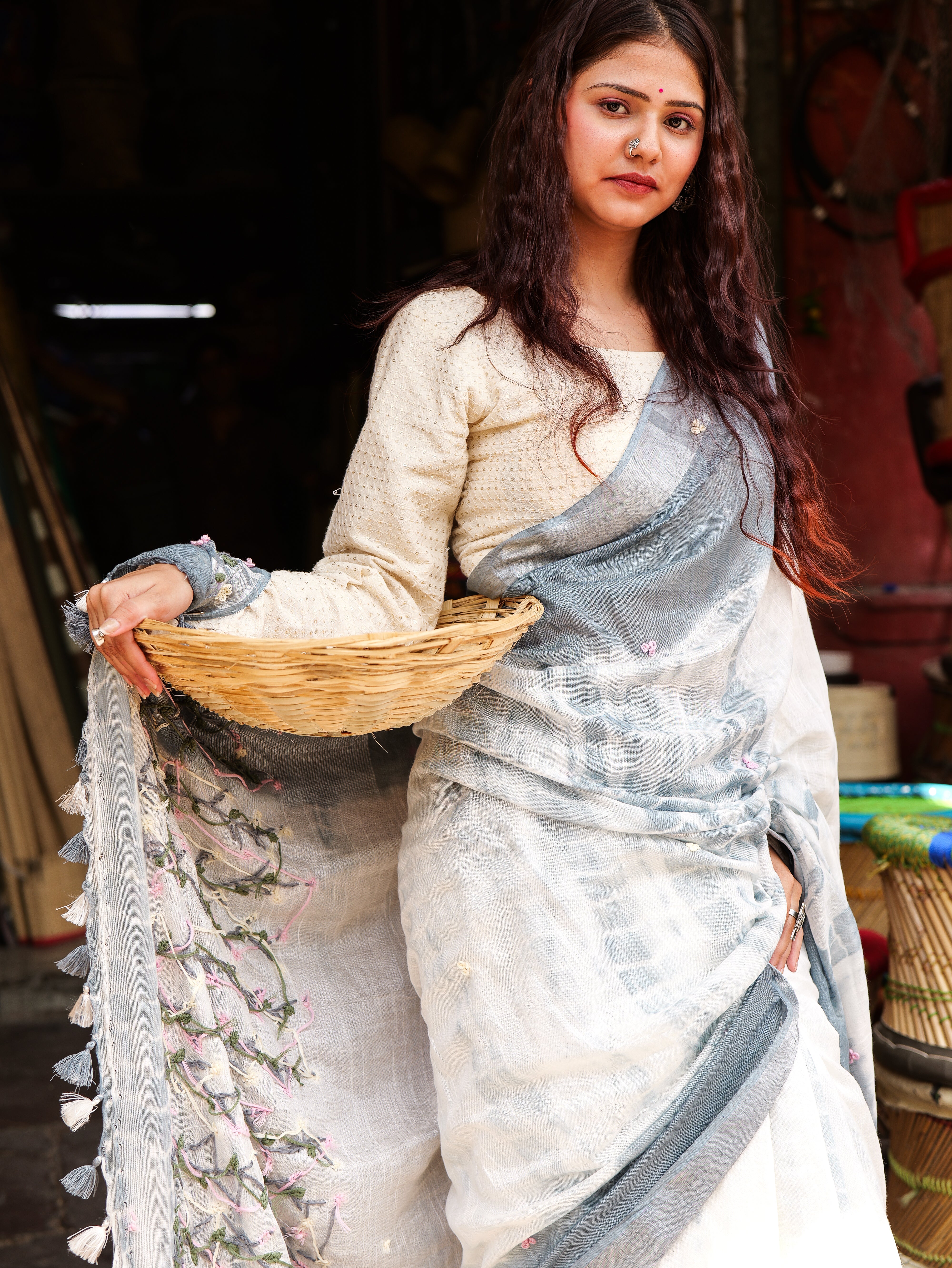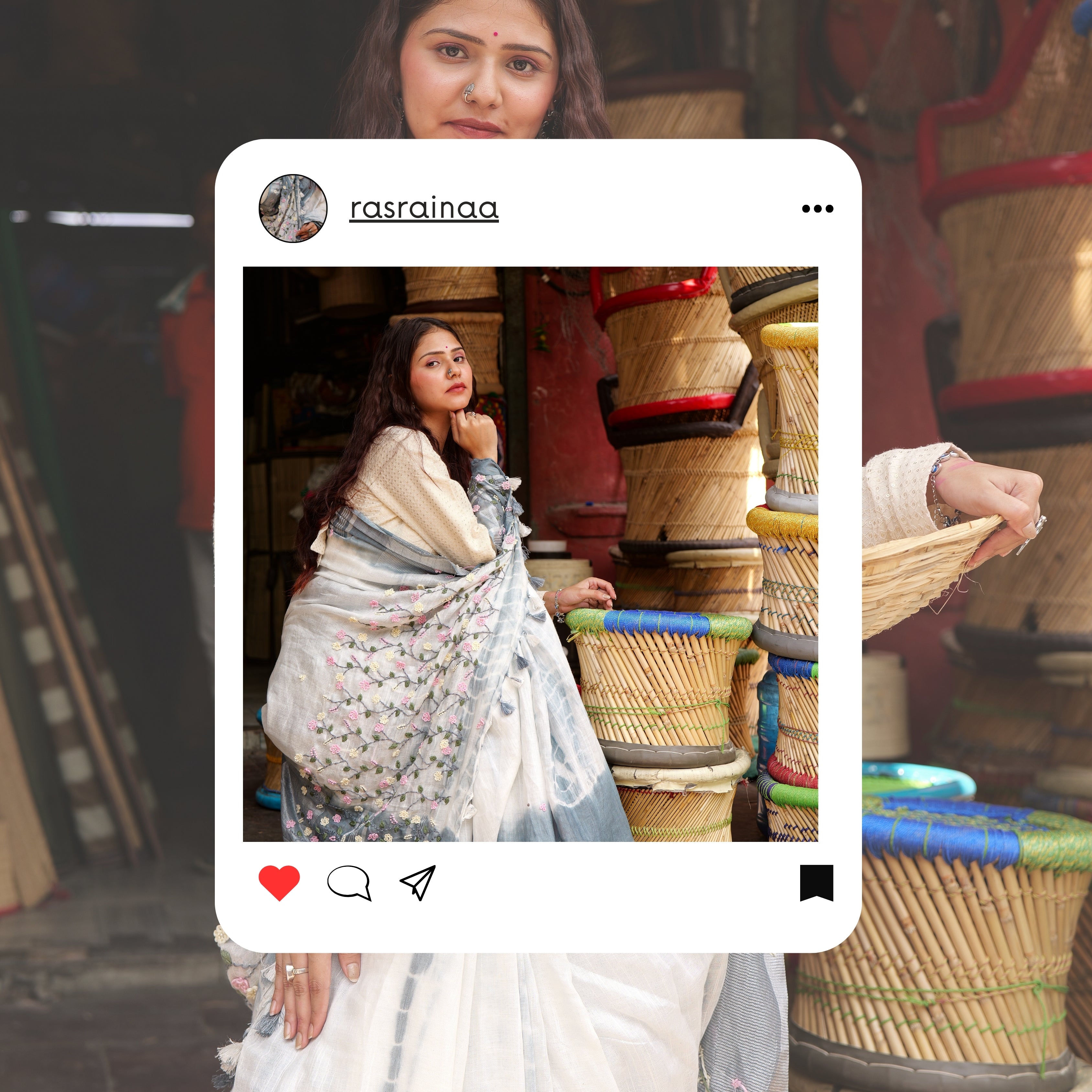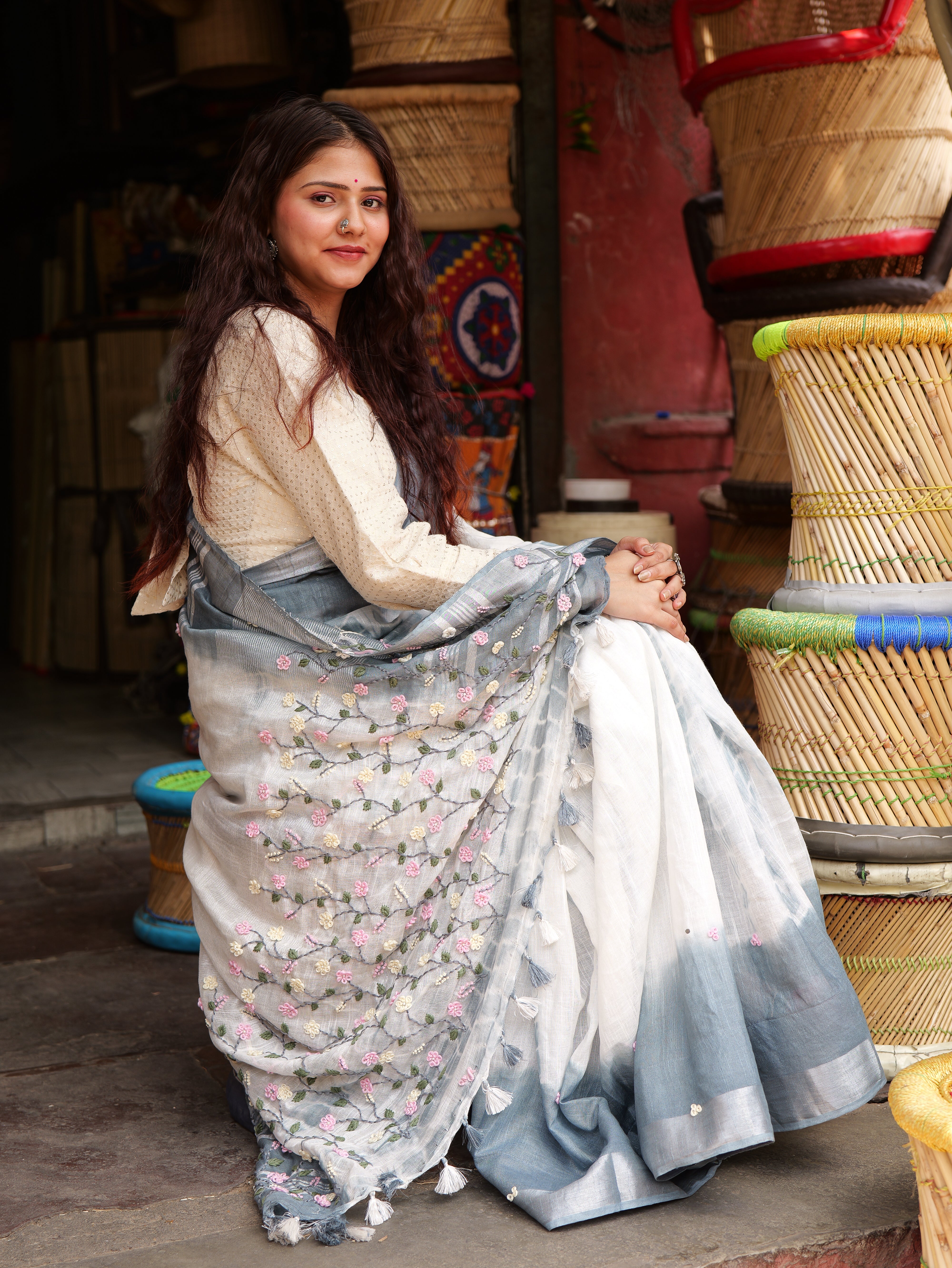 Step into timeless elegance with Noor-e-Chandni, a saree that embodies the glow of moonlight and the charm of vintage artistry. Crafted in soft grey and white hues, this ethereal drape features intricate embroidery that weaves tradition into every thread. The delicate craftsmanship and regal appeal make it perfect for special occasions, celebrations, and moments that call for effortless grace.