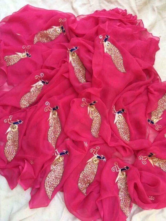 Step into the spotlight with Mayur Gulabi, a luxurious fuchsia pink pure chiffon saree adorned with intricate handwork inspired by peacock motifs. Crafted for grace and grandeur, the soft chiffon drapes like a dream, while the delicate embellishments add a royal charm. Ideal for festive soirées, weddings, or any moment you want to make unforgettable.