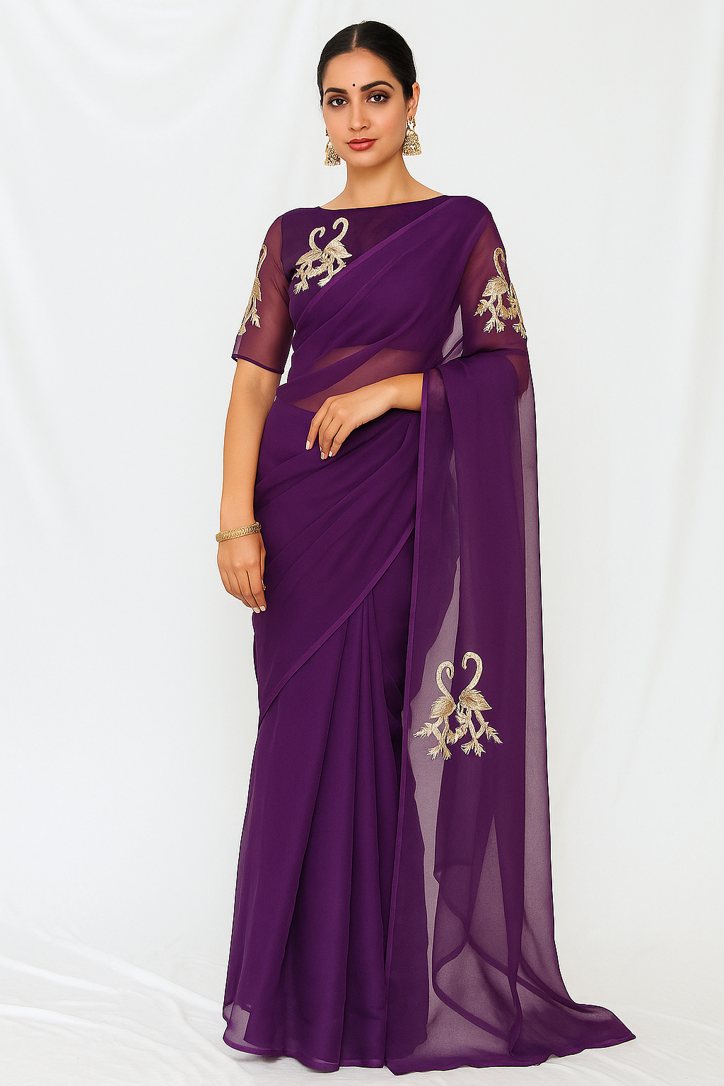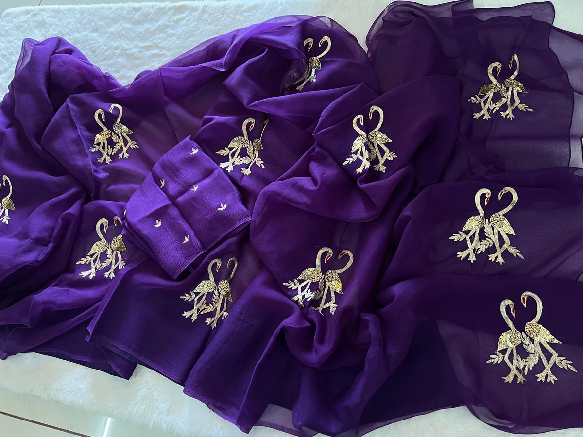 Drape yourself in timeless beauty with our Mayur Rang saree – a masterpiece in pure chiffon. Featuring exquisite flamingo-inspired handwork, every detail glimmers with artisanal finesse and vibrant charm. Lightweight and fluid, this 5.5-meter saree offers a graceful fall that flatters every silhouette. Perfect for festive occasions, weddings, or elegant evenings.