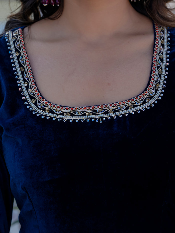 Drape yourself in majestic elegance with NeelMahal, a stunning handcrafted royal blue velvet Anarkali suit from Rasrainaa. Inspired by the grandeur of royal palaces and timeless heritage, this masterpiece blends luxurious craftsmanship with contemporary grace. The rich velvet fabric, intricate handwork, and regal flow make it a perfect choice for weddings, festive celebrations, and special occasions.