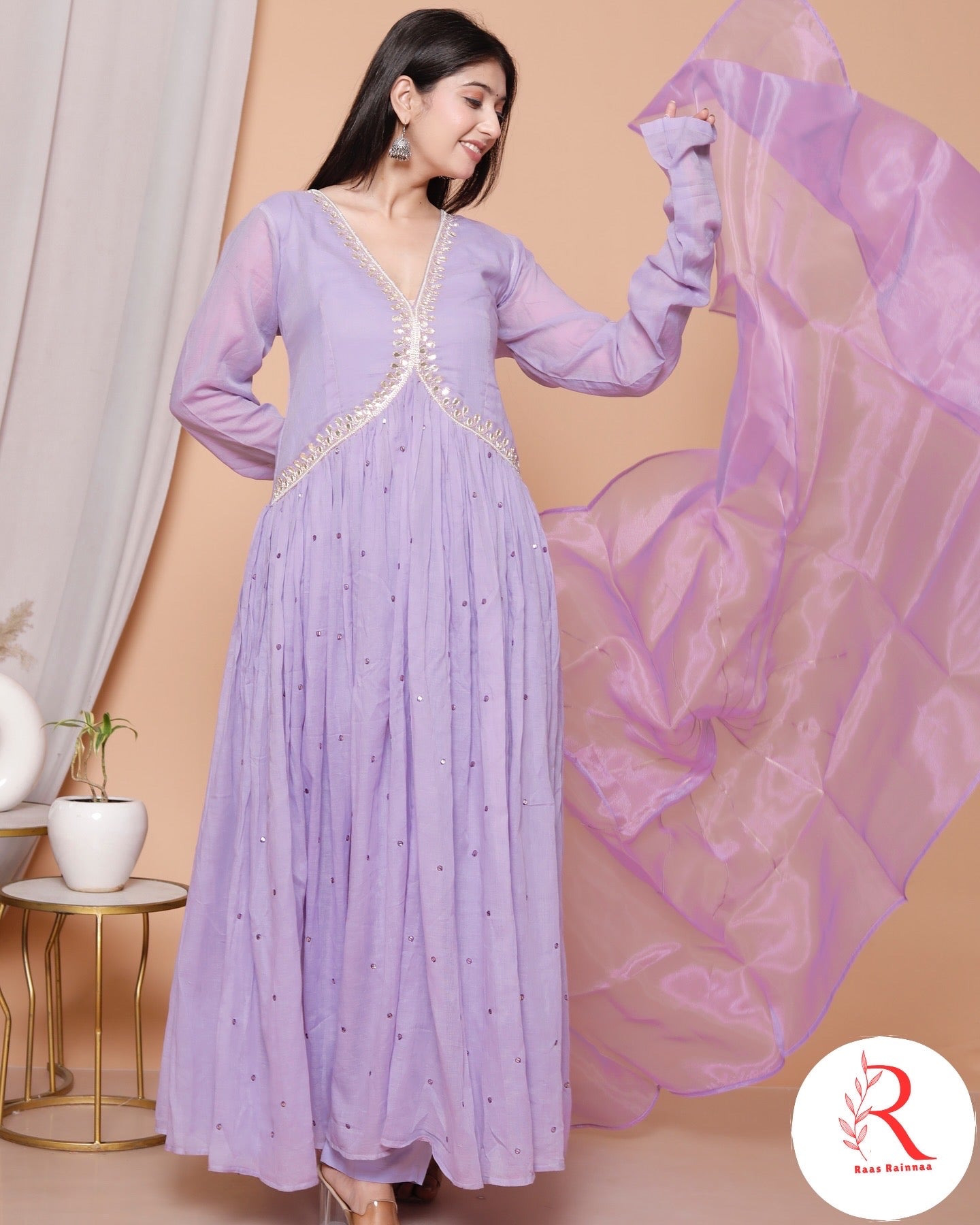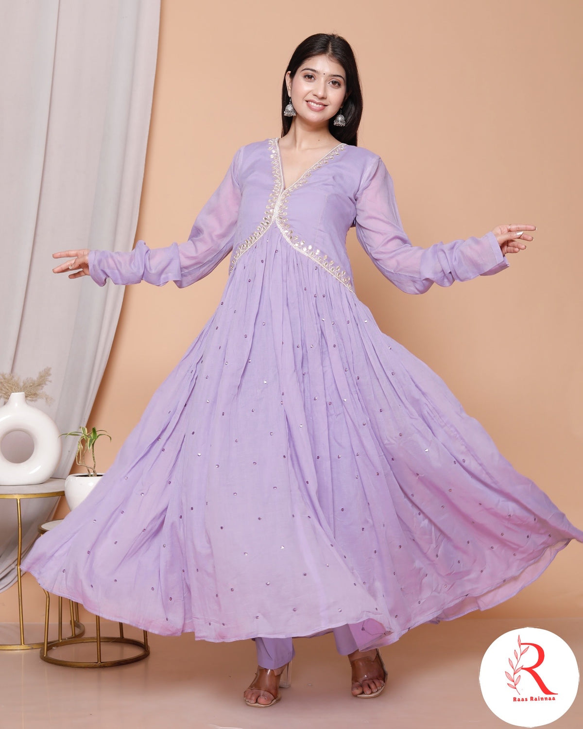 [lavender mulmul anarkali, handworked anarkali set, cotton anarkali for summer, breathable festive wear, size inclusive Indian wear, plus size anarkali suit, mulmul ethnic set, cotton anarkali 5XS to 10XL, handmade detailing, wholesale ethnic outfits]