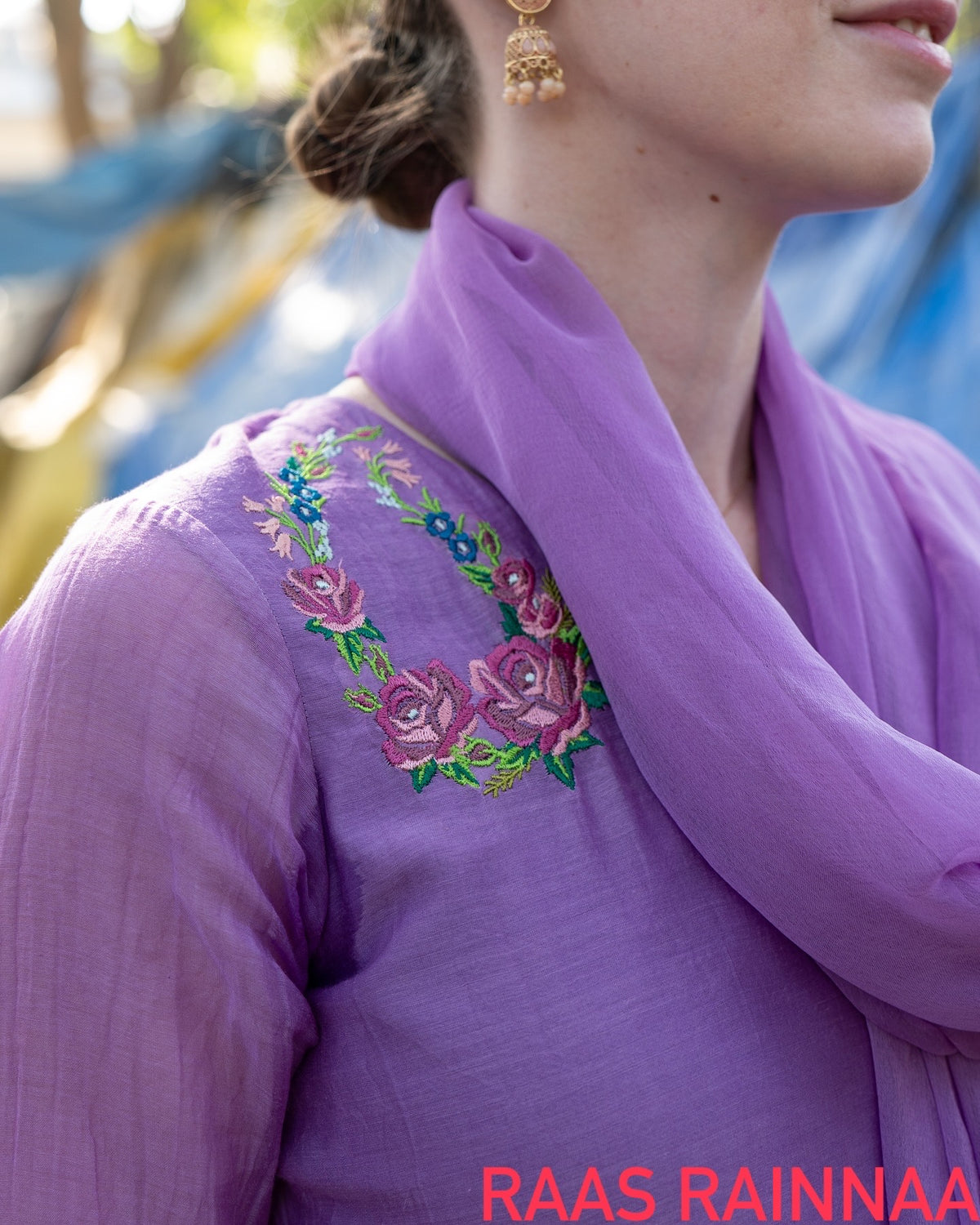 Each piece is delicately embroidered, featuring pastel tones that reflect the calm of dusk and the timeless beauty of Indian craftsmanship. With lightweight fabric and graceful silhouettes, these suits are perfect for festive evenings, intimate celebrations, and moments that call for understated elegance.