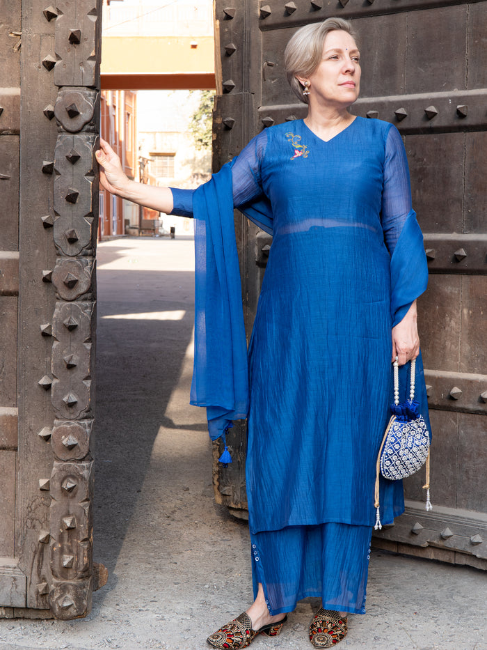 Each piece is delicately embroidered, featuring pastel tones that reflect the calm of dusk and the timeless beauty of Indian craftsmanship. With lightweight fabric and graceful silhouettes, these suits are perfect for festive evenings, intimate celebrations, and moments that call for understated elegance.