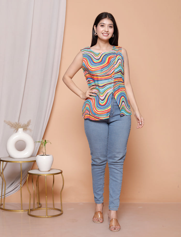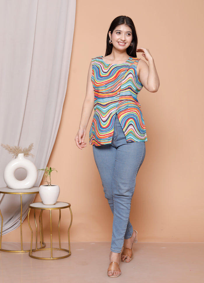 Introducing the KaleidoWave Top, a vibrant celebration of color and movement. This sleeveless cotton print top features a dazzling, multicolored wave pattern that brings a dynamic energy to your wardrobe. The front cut design adds a modern edge, while the stylish button details create a flattering silhouette that’s as functional as it is fashionable.