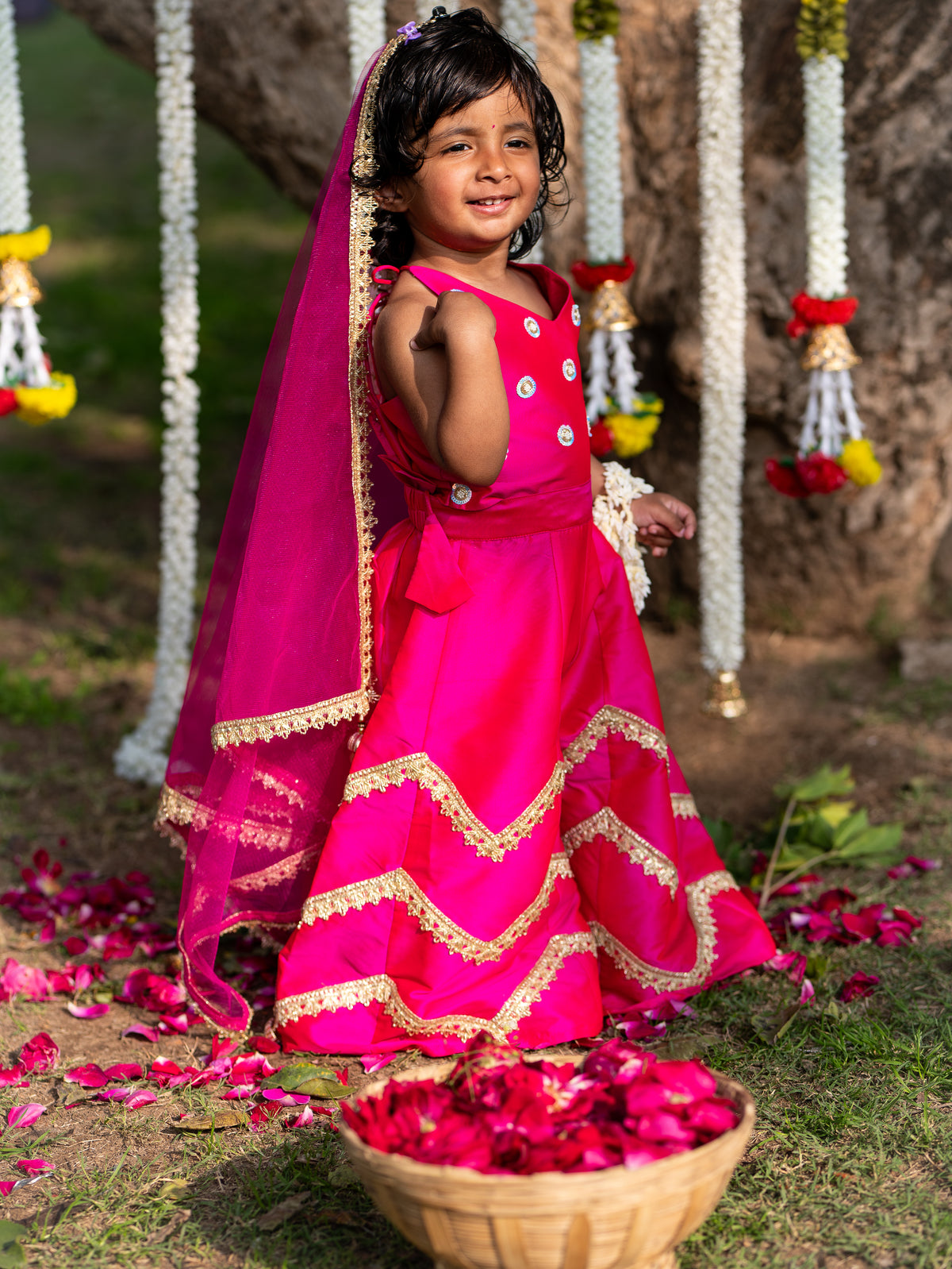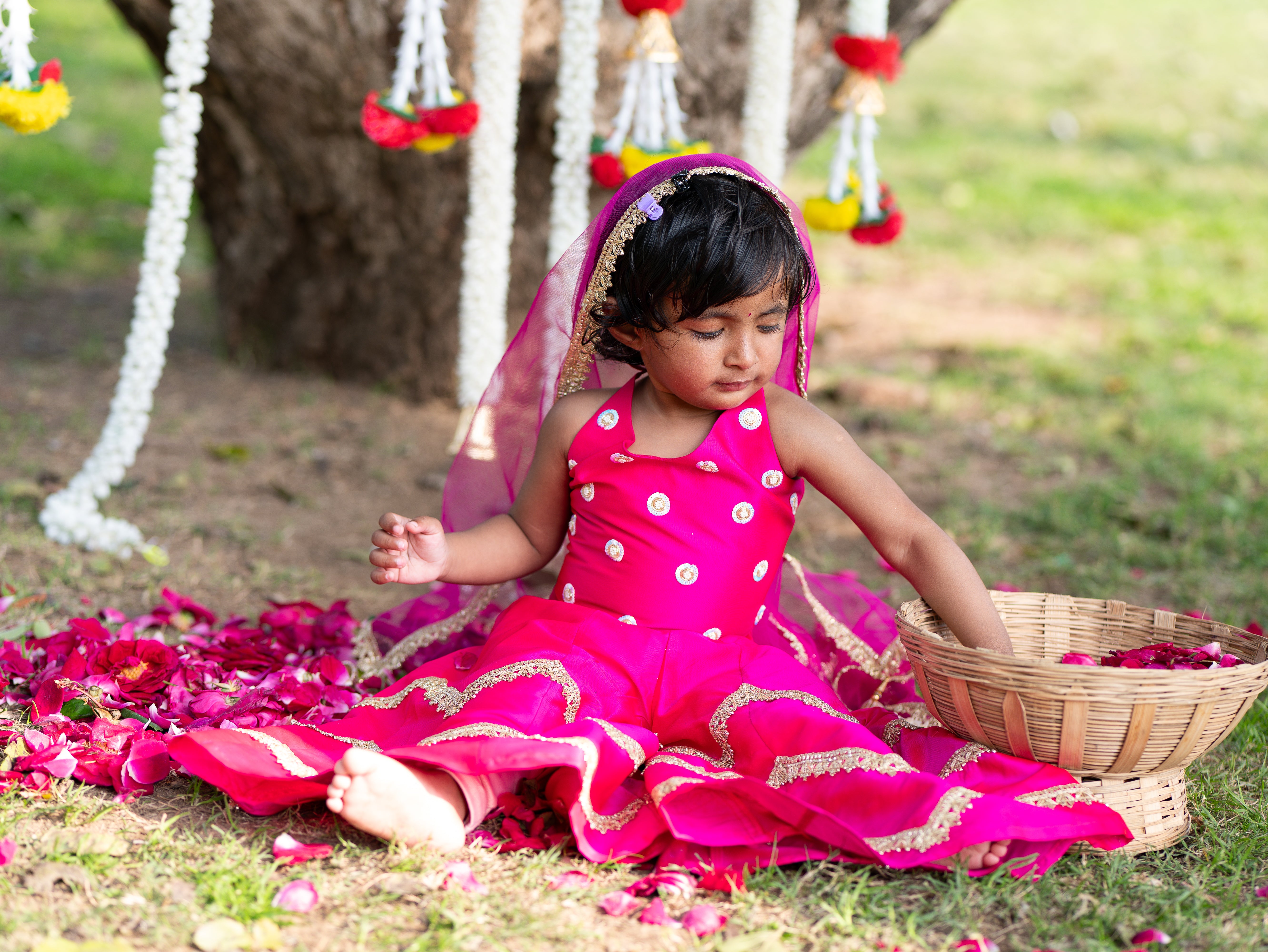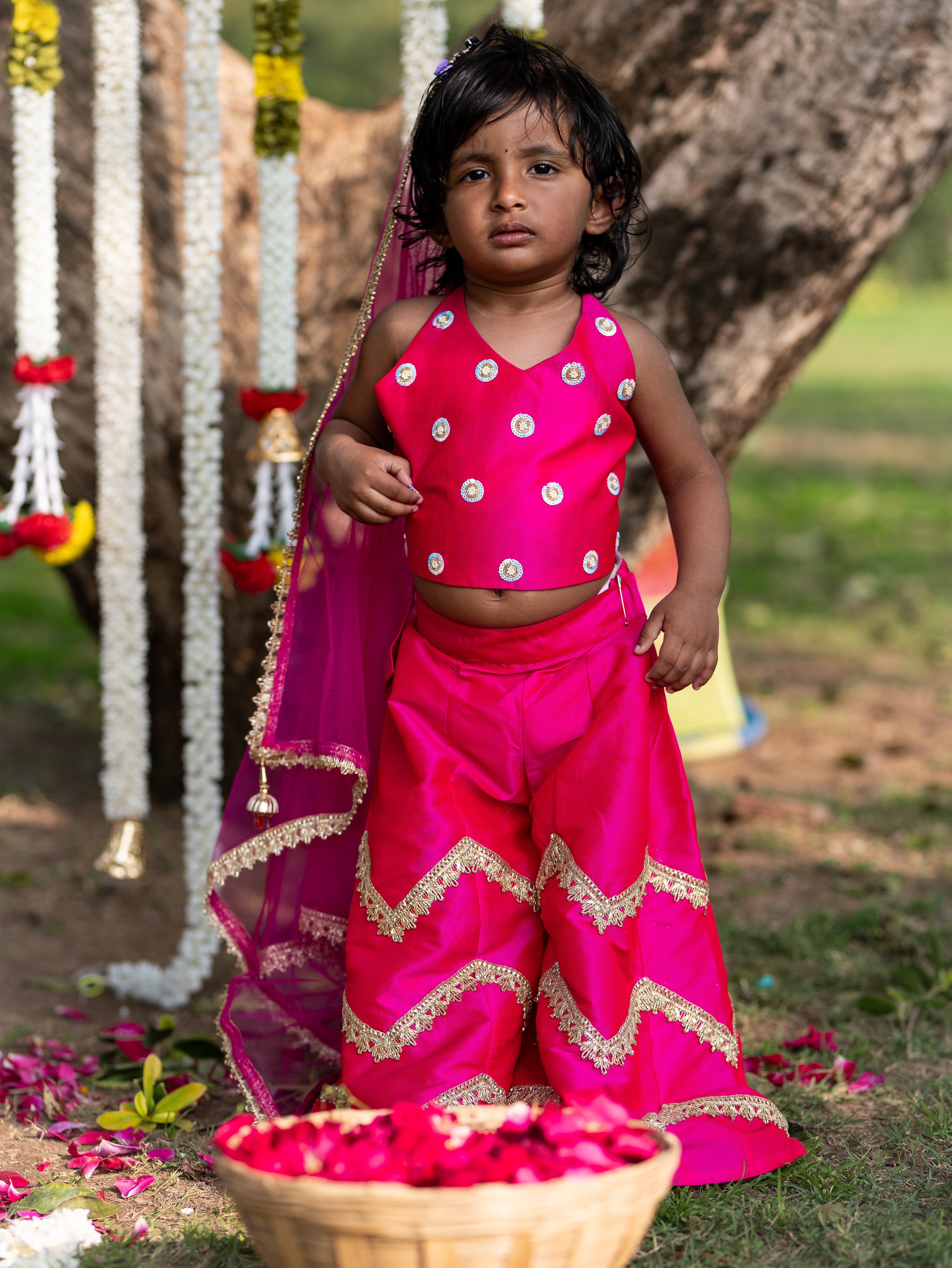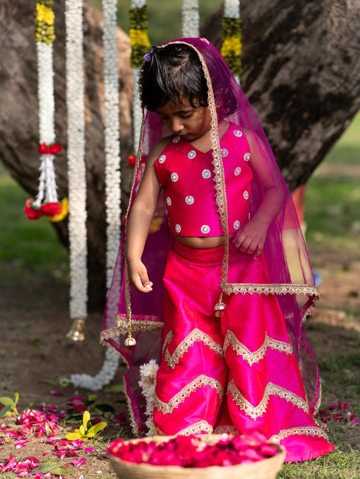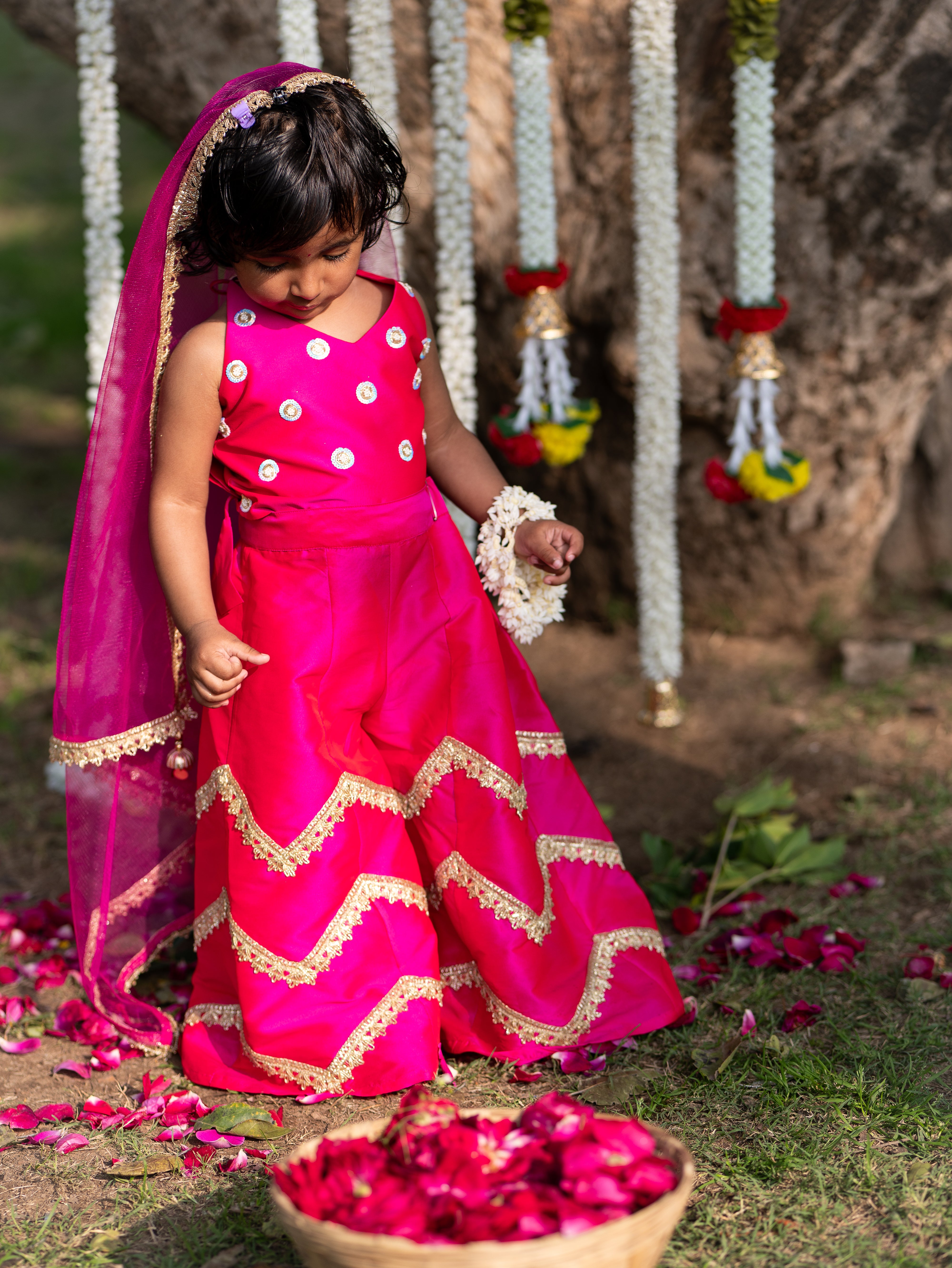 Designed for little royals, the Gulabo Siya set beautifully blends elegance with comfort. This exquisite ensemble features a delicately handcrafted top, a gracefully flowing palazzo, and a stylish belt dupatta, all adorned with intricate handwork and fine lace detailing. The regal pink hue adds a touch of tradition, while the modern silhouette ensures effortless charm.